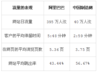 无论是客户的平均停留时间、在网页的平均浏览页数、网站平均跳出率来看,阿里巴巴也优于中国制造网。
